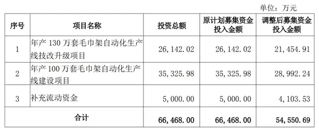 具体来看,"年产130万套毛巾架自动化生产线技改升级项目"从2.61亿元缩减至2.15亿元;"年产100万套毛巾架自动化生产线建设项目"由3.53亿元降至2.90亿元;补充流动资金也从5000万元压缩至4103.53万元。