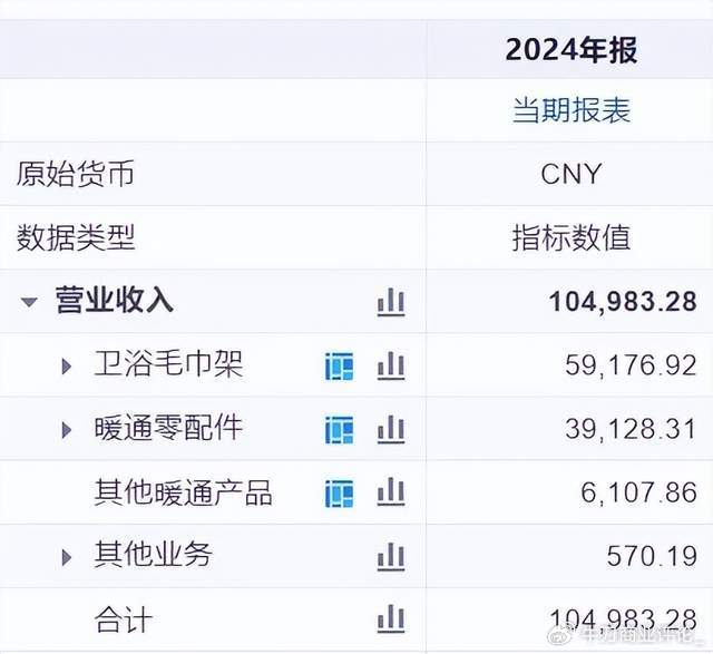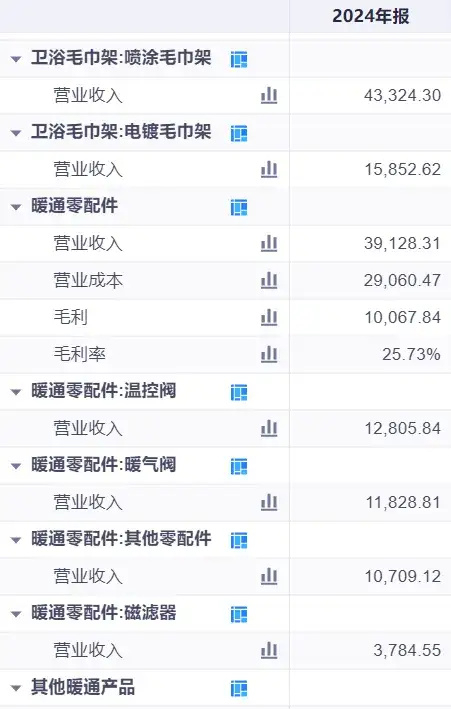 尽管公司早在2021年就开始布局智能家居、健康电器等新方向,但到2024年其营收结构显示,传统卫浴毛巾架与暖通零配件仍合计占比超过94%,新业务收入占比预计不足5%,且智能产品毛利率较传统产品低4.5个百分点。
