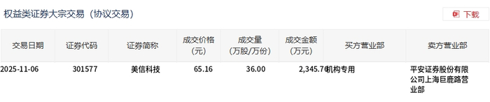 11月6日,美信科技大宗交易成交36万股,成交额2345.76万元,占当日总成交额的14.77%,成交价65.16元,较市场收盘价65.92元折价1.15%。