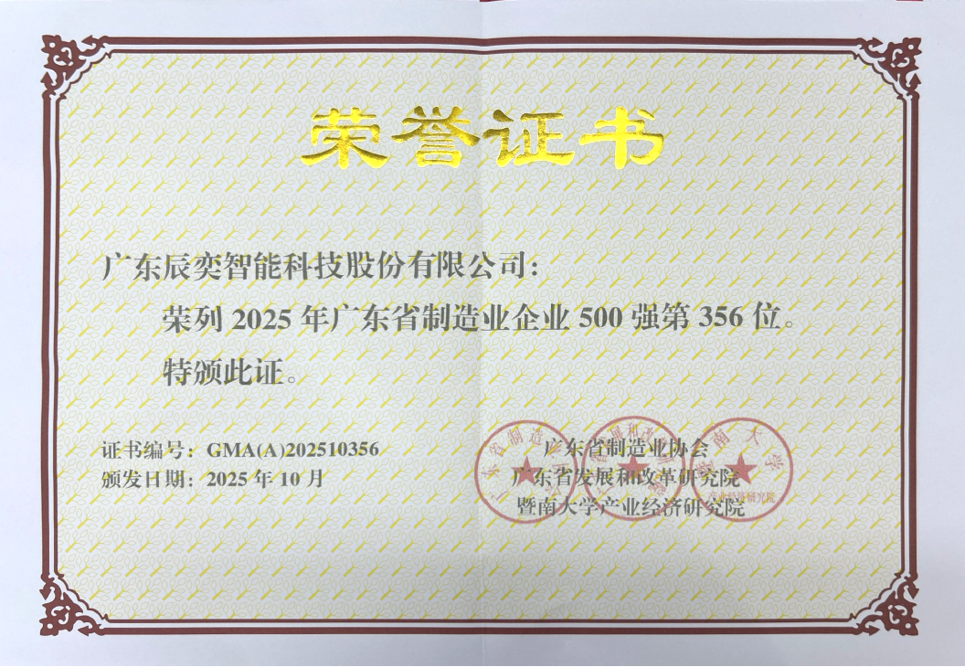 近日,辰奕智能再添荣誉 —— 成功入选2025年广东省制造业企业500强,位列第356位,较去年排名提升64位,彰显了公司在智能制造领域的强劲发展势头。