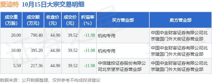 10月15日爱迪特现3笔折价11.98%的大宗交易 合计成交1402.96万元