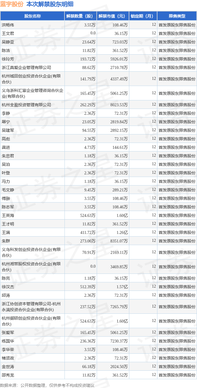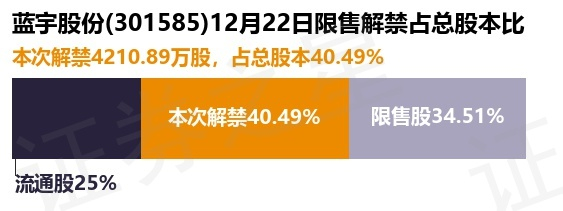 蓝宇股份(301585)4210.89万股限售股将于12月22日解禁,占总股本40.49%