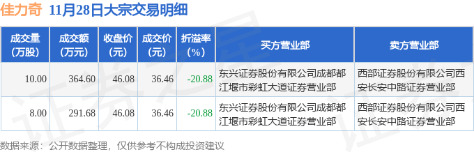 11月28日佳力奇现2笔折价20.88%的大宗交易 合计成交656.28万元