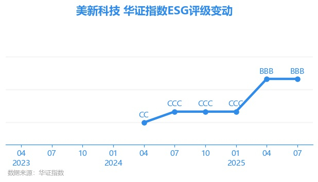 日前,华证指数公布了新一期(2025年7月31日)的ESG评级结果,美新科技(301588.SZ)获得BBB评级(华证指数评级为C起至AAA九档,C为最低档,AAA为其最高一级评级/AA为其第二档),上一期(2025年4月30日)ESG评级为BBB。本期ESG评级在147家家庭耐用消费品行业A股上市公司中排名第23(上一期排名第30)。