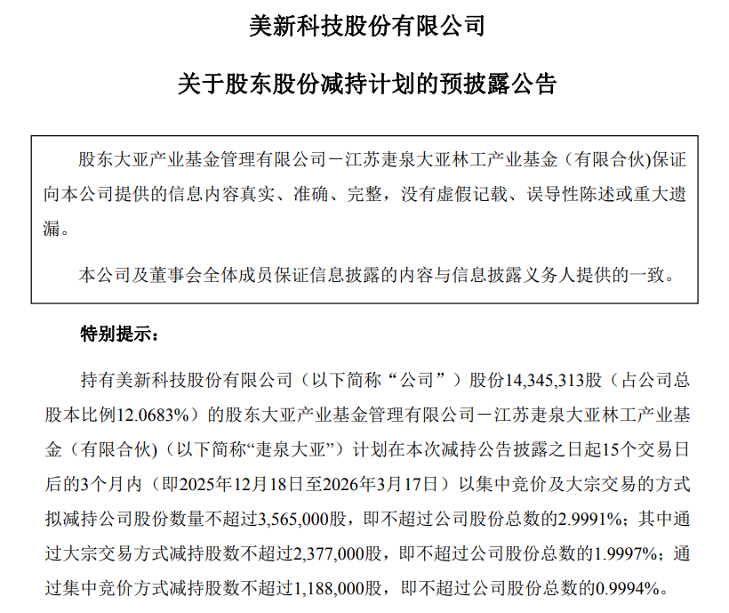 11月27日,美新科技(301588.SZ)发布公告,持股12.0683%的股东大亚产业基金管理有限公司-江苏疌泉大亚林工产业基金(有限合伙)(简称“疌泉大亚”)计划在本次减持公告披露之日起15个交易日后的3个月内(即2025年12月18日至2026年3月17日)以集中竞价及大宗交易的方式拟减持公司股份数量不超过356.5万股,即不超过公司股份总数的2.9991%。