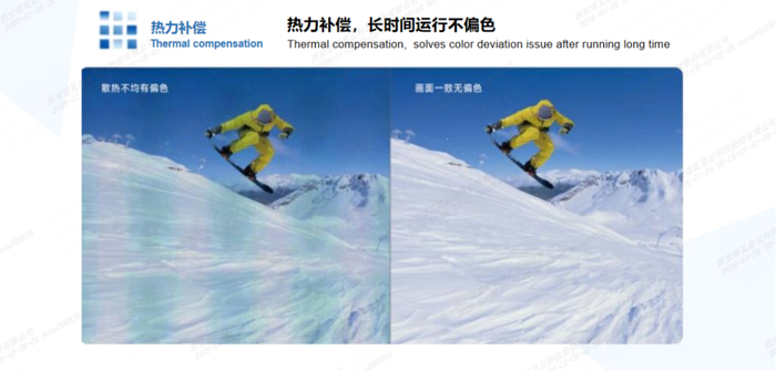 据悉,诺瓦星云自适应热力补偿算法,可实时推算箱体热力特性变化并动态调整热力补偿系数,精准解决因屏体不同区域温度分布不均,导致的色温漂移、红色条纹、电源及驱动IC位置发青等问题,从而保障箱体颜色与色温的精准呈现。
