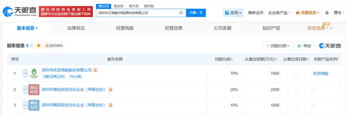 雷达财经讯,天眼查App显示,3月19日,深圳市艾格数字能源科技有限公司成立,法定代表人为柏建国,注册资本1亿人民币,经营范围包括配电开关控制设备研发、输配电及控制设备制造、计算机软硬件及外围设备制造等。股东信息显示,该公司由优优绿能(301590)、深圳市厚启投资合伙企业(有限合伙)、深圳市枫茗投资合伙企业(有限合伙)共同持股。