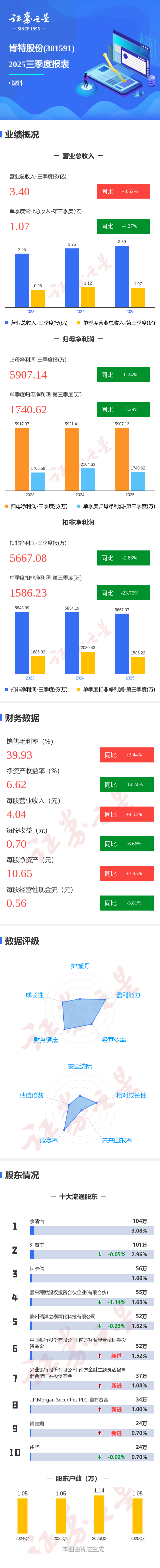 证券之星消息,肯特股份2025年三季报显示,公司主营收入3.4亿元,同比上升4.53%;归母净利润5907.14万元,同比下降0.24%;扣非净利润5667.08万元,同比下降2.86%;其中2025年第三季度,公司单季度主营收入1.07亿元,同比下降4.27%;单季度归母净利润1740.62万元,同比下降17.3%;单季度扣非净利润1586.23万元,同比下降23.75%;负债率8.78%,投资收益212.02万元,财务费用-210.29万元,毛利率39.93%。