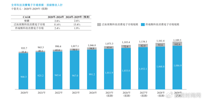 当前,消费电子配件市场正同时处于规模扩容与格局重塑的阶段。弗若斯特沙利文报告显示,2024年,全球科技消费电子市场规模达到10460亿美元,预计到2029年将增长至11895亿美元,2024年至2029年的年复合增长率约为2.6%。