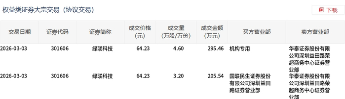 3月3日,绿联科技大宗交易成交7.8万股,成交额501万元,占当日总成交额的1.01%,成交价64.23元,较市场收盘价69.82元折价8.01%。