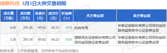 3月3日绿联科技现2笔大宗交易 机构净买入295.46万元