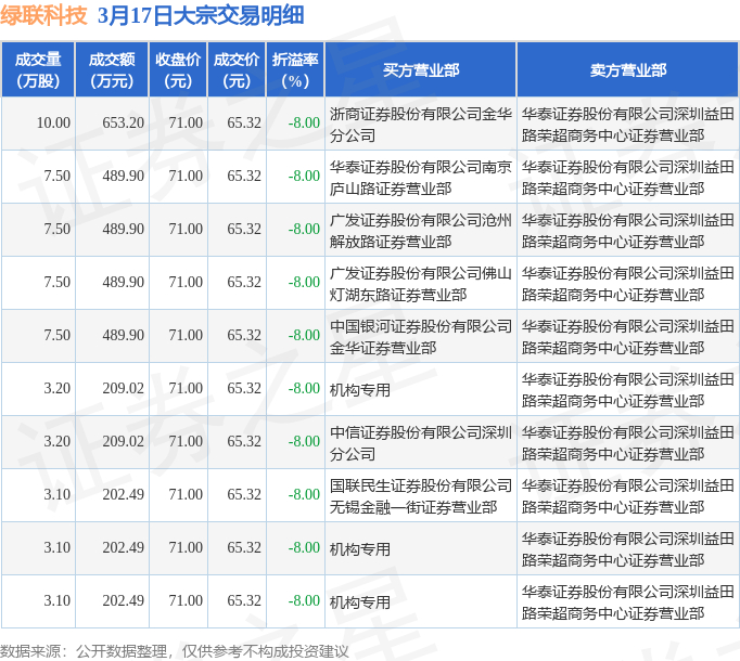 3月17日绿联科技现10笔大宗交易 机构净买入614万元
