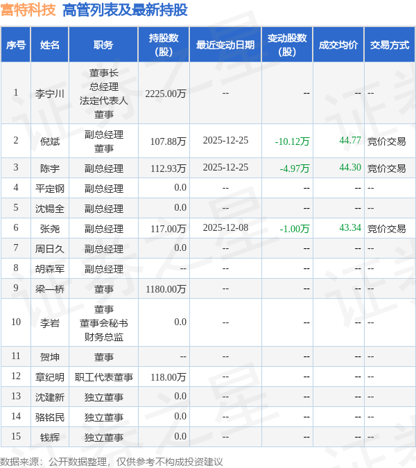 富特科技的高管列表及最新持股情况如下: