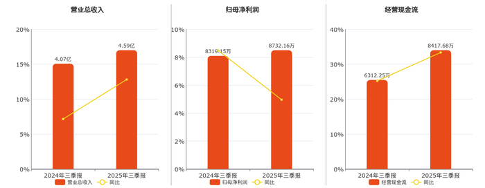 公司营业总收入为4.59亿元,较去年同报告期营业总收入增加4305.87万元,实现2年连续上涨,同比较去年同期上涨10.34%。归母净利润为8732.16万元,较去年同报告期归母净利润增加616.64万元,实现2年连续上涨,同比较去年同期上涨7.60%。经营活动现金净流入为8417.68万元,较去年同报告期经营活动现金净流入增加2105.42万元,实现2年连续上涨,同比较去年同期上涨33.35%。