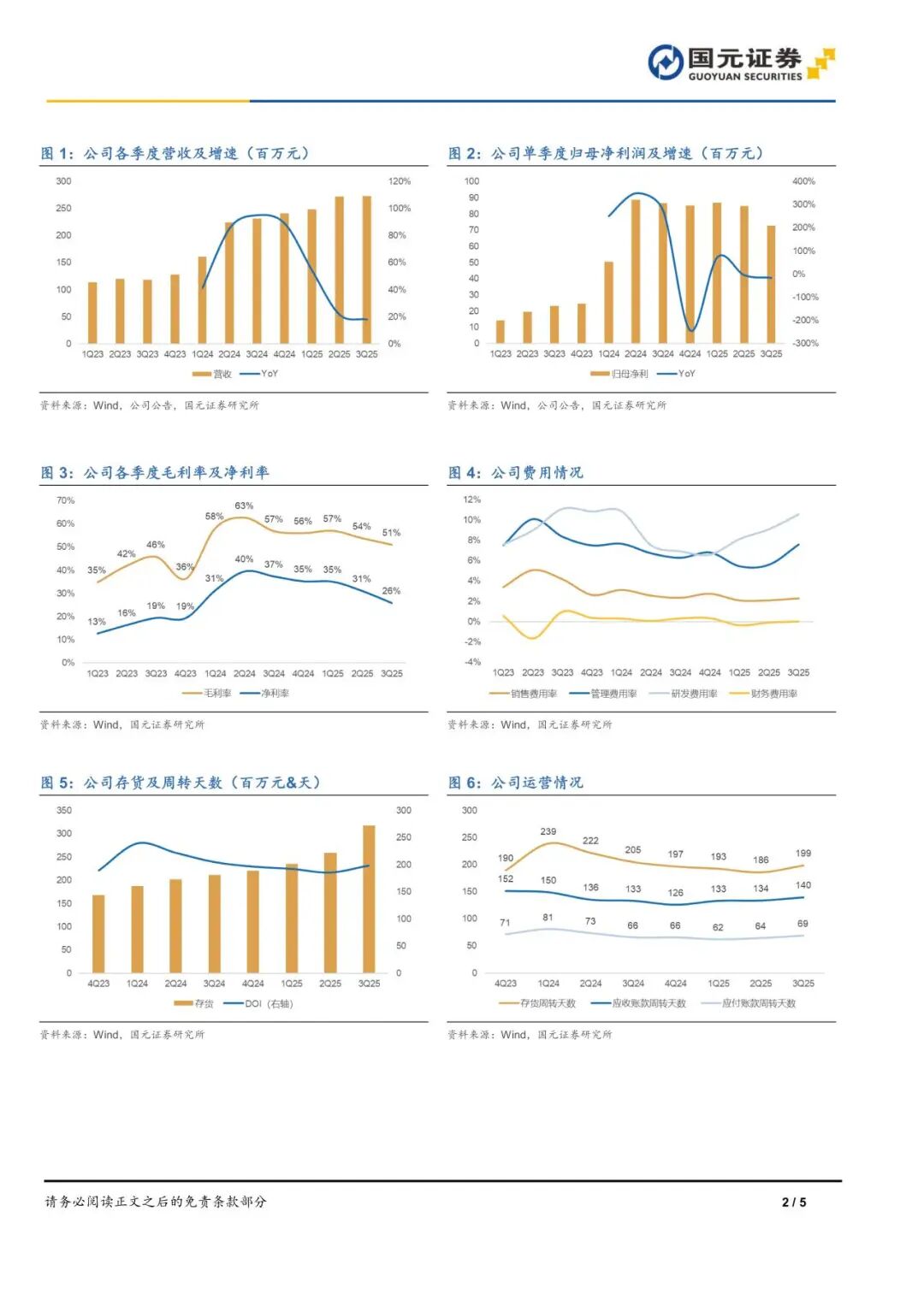 10月30日,公司发布2025Q1-Q3业绩公告,25Q1-Q3营收实现7.94亿元(YoY+28.86%),归母净利2.45亿元(YoY+8.29%),毛利率和净利率分别为53.94%和30.56%。单季度25Q3方面,公司营收实现2.74亿元(YoY+18.10%,QoQ+0.38%),归母净利实现0.73亿元(YoY-16.16%,QoQ-14.29%),毛利率和净利率分别为51.12%和25.88%。