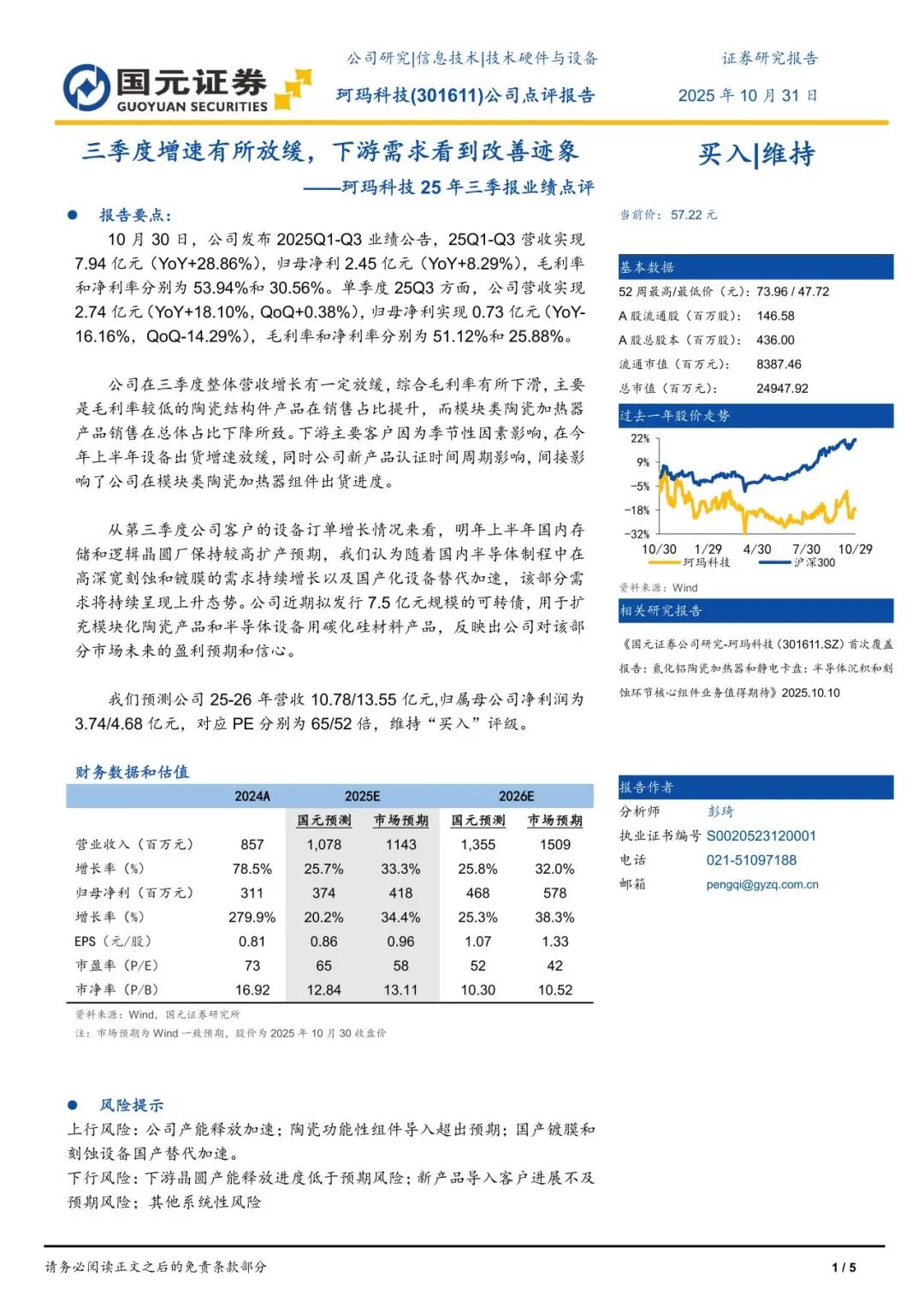 本报告摘自国元证券2025年10月31日已发布的《三季度增速有所放缓,下游需求看到改善迹象——珂玛科技25年三季报业绩点评》,具体报告及分析内容请详见报告。若因对报告的摘编等产生歧义,应以报告发布当日的完整内容为准。