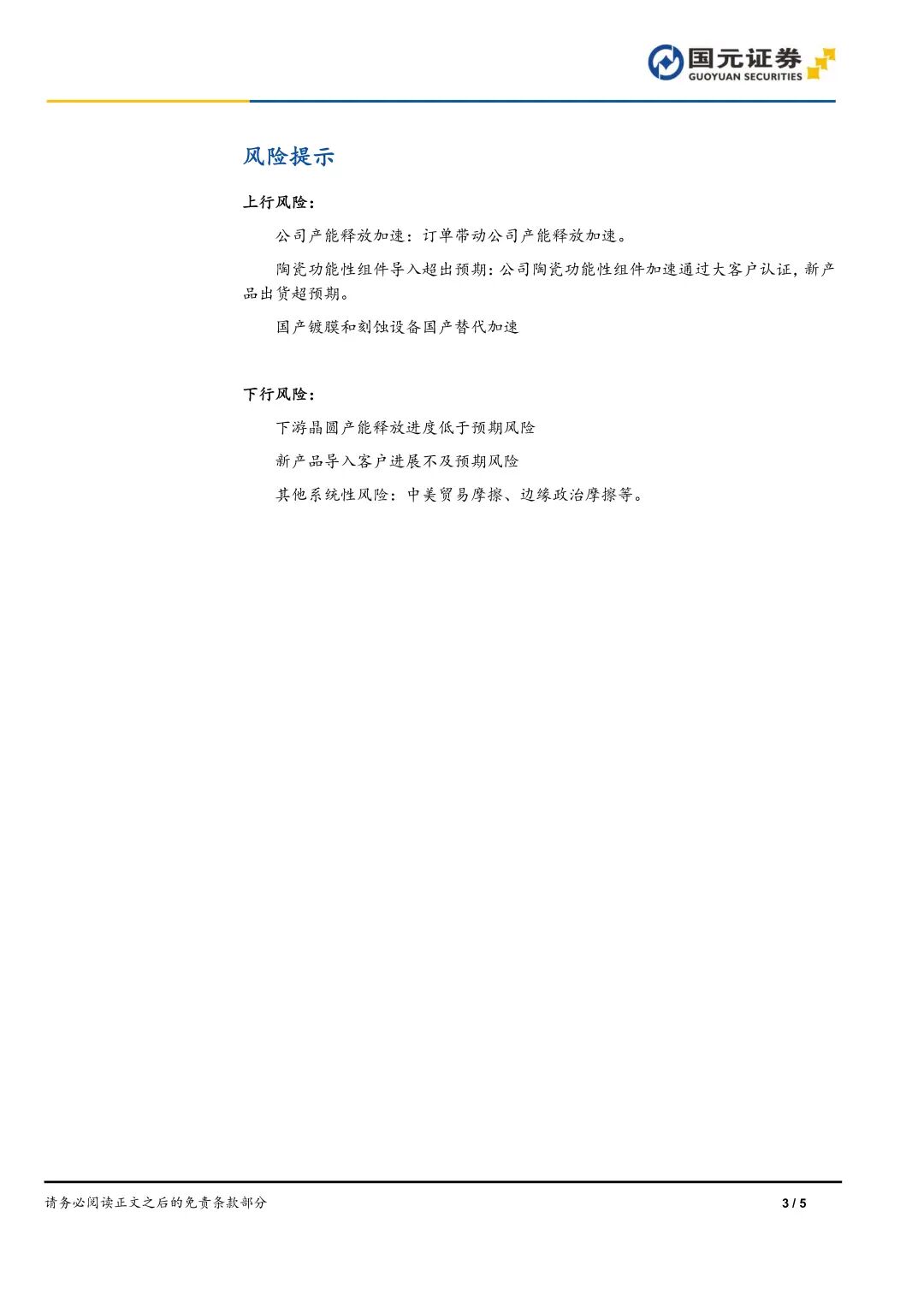 上行风险:公司产能释放加速;陶瓷功能性组件导入超出预期;国产镀膜和刻蚀设备国产替代加速。