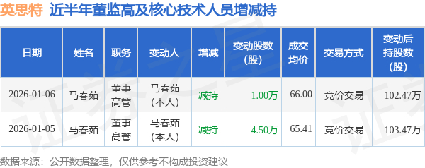 英思特:1月6日高管马春茹减持股份合计10000股
