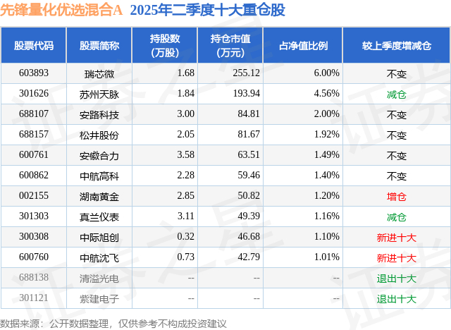 先锋量化优选混合A的前十大重仓股如下: