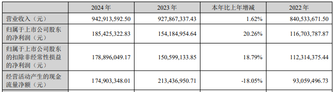 2024年,苏州天脉营业收入为9.43亿元,同比增长1.62%;归属于上市公司股东的净利润1.85亿元,同比增长20.26%;归属于上市公司股东的扣除非经常性损益的净利润1.79亿元,同比增长18.79%;经营活动产生的现金流量净额1.75亿元,同比下降18.05%。