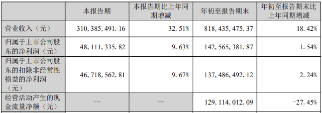 2025年前三季度,苏州天脉营业收入为8.18亿元,同比增长18.42%;归属于上市公司股东的净利润1.43亿元,同比增长1.54%;归属于上市公司股东的扣除非经常性损益的净利润1.37亿元,同比增长2.24%;经营活动产生的现金流量净额1.29亿元,同比下降27.45%。