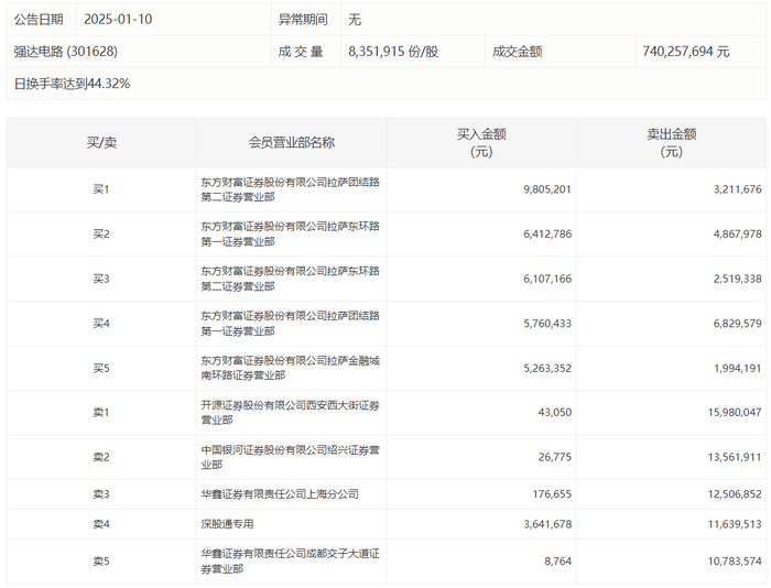 强达电路1月10日涨5.97%,龙虎榜数据显示,上榜营业部席位全天成交1.21亿元,占当日总成交金额比例为16.36%。其中,买入金额为3724.59万元,卖出金额为8389.47万元,合计净卖出4664.88万元。