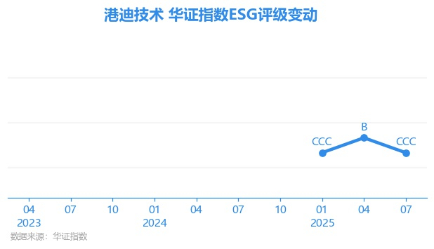 日前,华证指数公布了新一期(2025年7月31日)的ESG评级结果,港迪技术(301633.SZ)获得CCC评级(华证指数评级为C起至AAA九档,C为最低档,AAA为其最高一级评级/AA为其第二档),上一期(2025年4月30日)ESG评级为B。本期ESG评级在321家电气设备行业A股上市公司中排名第275(上一期排名第263)。