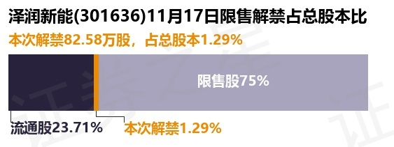 泽润新能(301636)82.58万股限售股将于11月17日解禁,占总股本1.29%