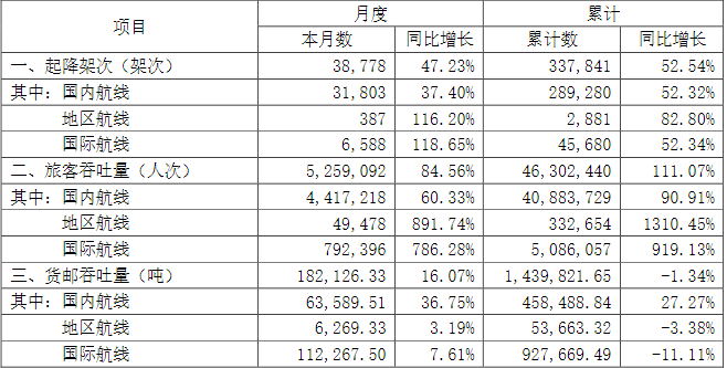 10月9日公告,前9月旅客吞吐量合计4630.24万人次,同比增111.07%。