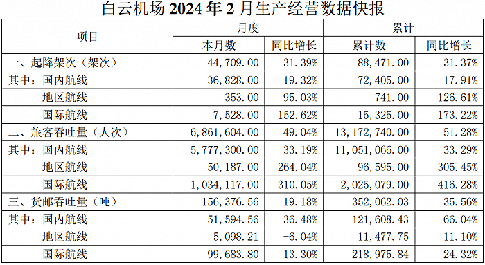 3月5日公告,2024年2月旅客吞吐量686.16万人次,同比增长49.04%;本年累计旅客吞吐量1317.27万人次,同比增长51.28%。