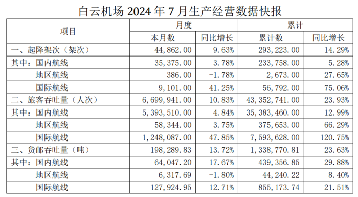 白云机场:前7月旅客吞吐量同比增长23.93%