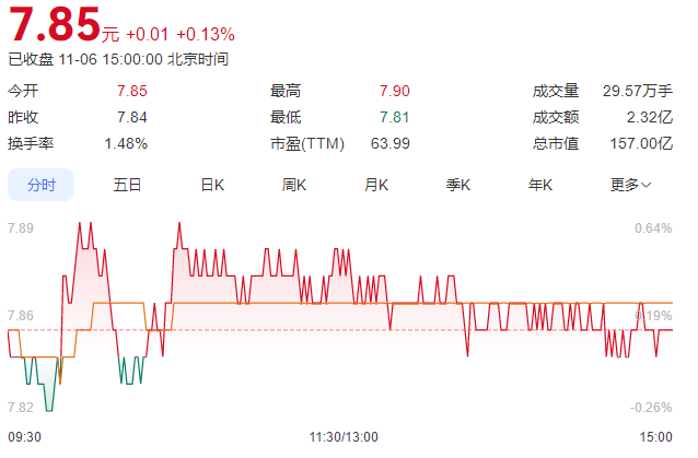 截至11月6日收盘,东风股份涨0.13%,报7.85元/股,总市值157亿元。