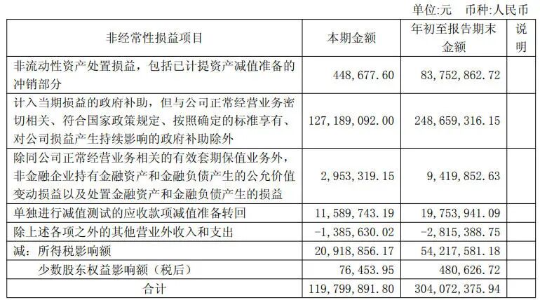 前三季度,东风股份非经常性损益合计3.04亿元,其中占比最大的是政府补助,当期计入的金额高达2.49亿元。