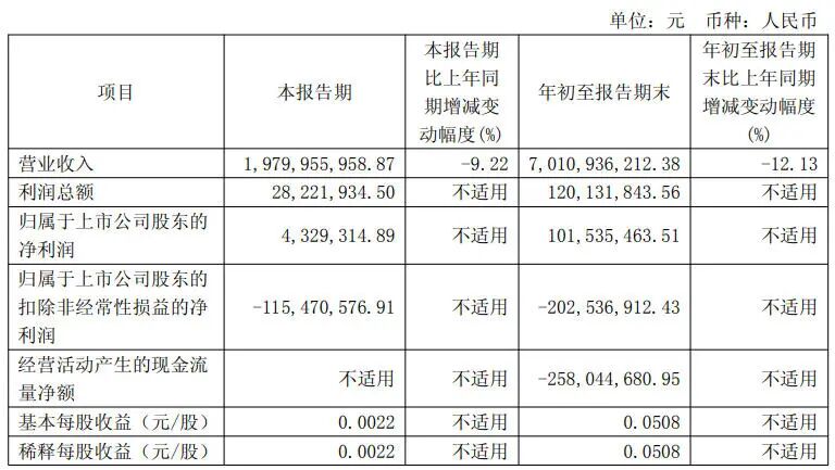 今年前三季度,公司实现营业收入为70.1亿元,同比下降12.1%;归母净利润自去年同期亏损1.15亿元后成功扭亏,实现归母净利润1.02亿元;扣非归母净利润自去年同期亏损3.0亿元变为亏损2.03亿元,亏损额有所减少;经营活动产生的现金流量净额为-2.58亿元,上年同期为-23.14亿元。