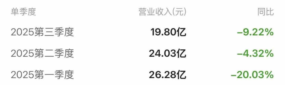 今年第一季度、第二季度、第三季度,公司分别实现营业收入26.28亿元、24.03亿元和19.8亿元,同比降幅分别为20.03%、4.32%和9.22%,环比降幅分别为11.17%、8.58%和17.59%,无论是同比还是环比均为下降趋势。