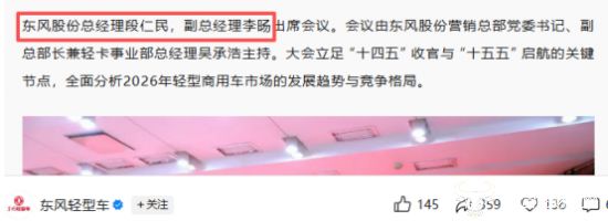 近日,运营商财经网注意到,在东风轻型车官方公众号发布的一篇文章中,李旸以东风股份副总经理现身其中,这意味着他的职务发生变化,从之前的神龙汽车副总经理调整为东风股份副总经理。
