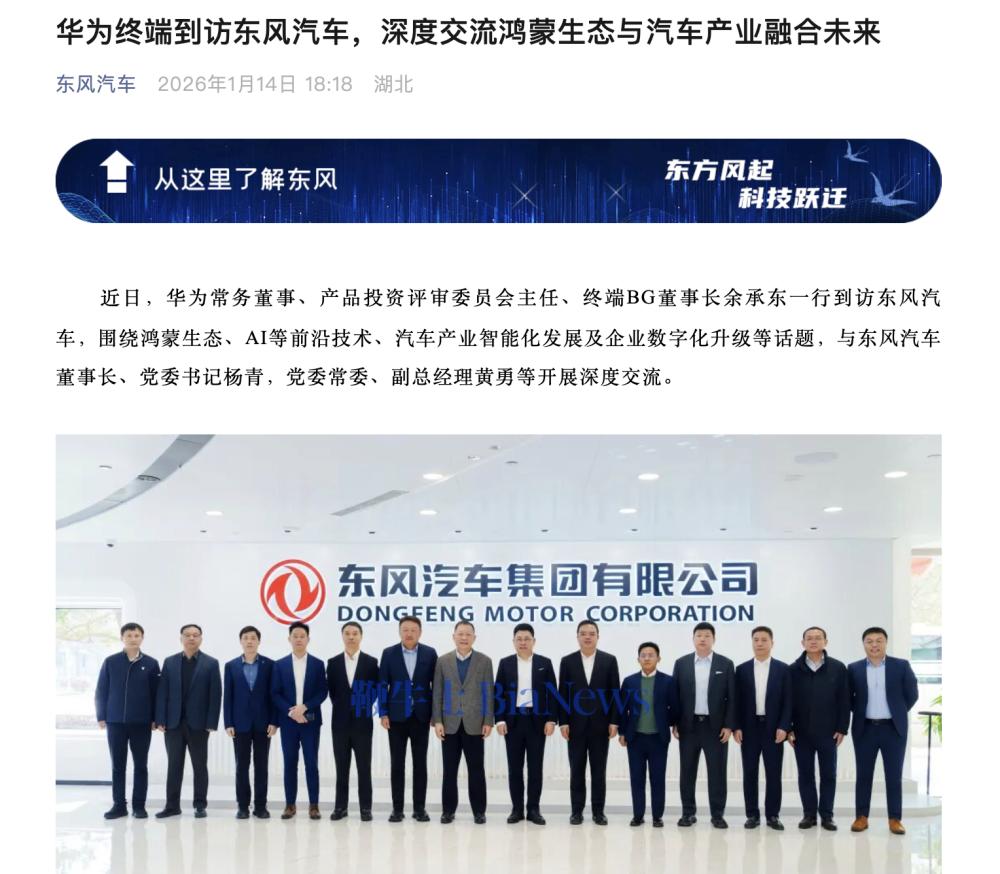 据介绍,2025年5月,东风汽车与华为签署全面深化战略合作协议,围绕汽车智能化、企业数字化和智能化升级、生态共建等领域持续开展全方位深度合作;9月,东风汽车与华为联合创新实验室正式揭牌,双方合作从单一产品扩展到全栈技术,协同创新版图持续扩容。