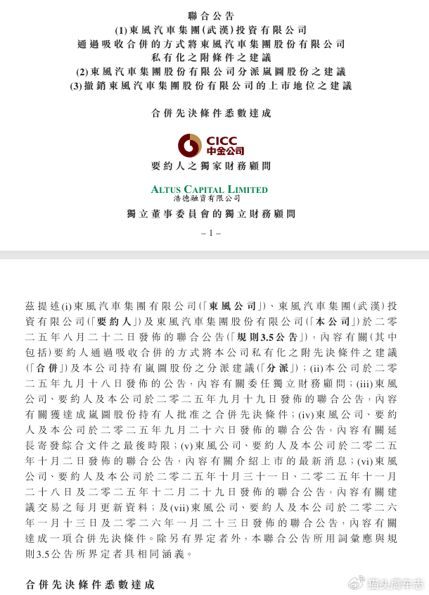 东风集团股份私有化迈出关键一步 合并先决条件悉数达成