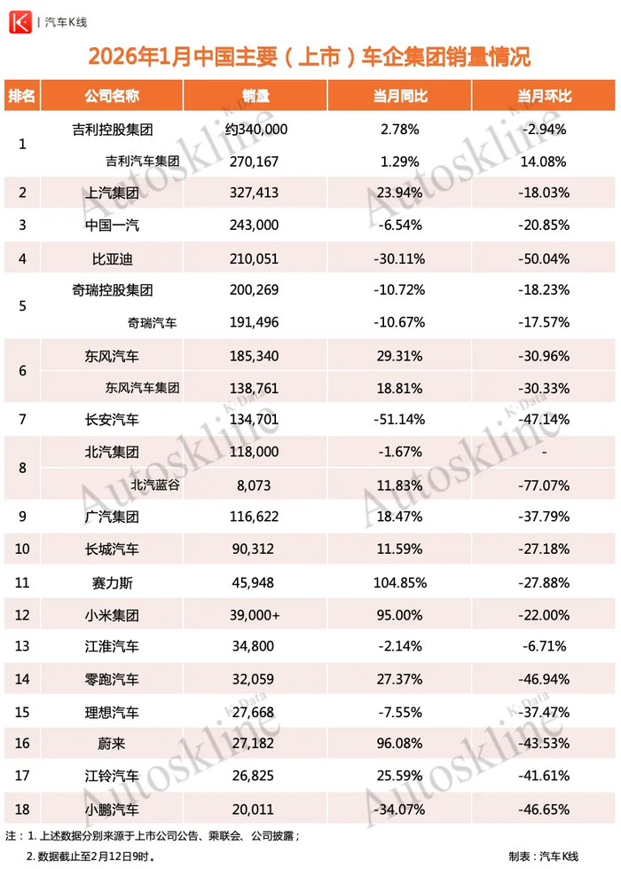 2026年1月,东风集团股份(0489.HK)销售13.88万辆,同比增长18.8%;超过同期长安汽车(000625.SZ)的13.47万辆;母公司东风汽车集团有限公司1月销售18.53万辆,同比增长约29.3%,挤进行业前五。