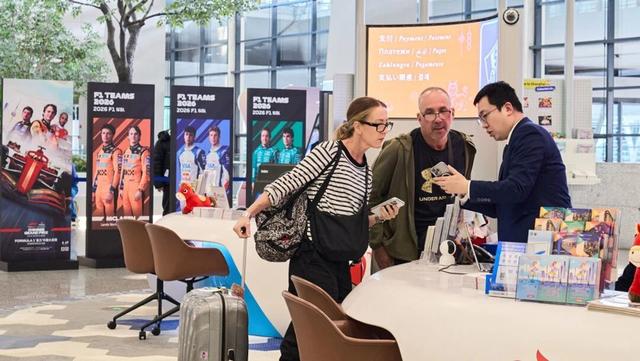 上海机场在浦东机场两座航站楼国际、港澳台到达区域分别打造了主题展台和推广区,展示F1赛车车模、装备和系列文创,介绍车手信息、赛程安排,推广赛事文化和上海城市形象,吸引旅客、车迷纷纷驻足打卡。机场外籍人员综合一站式服务中心、旅游咨询服务中心也装扮一新,围绕F1主题进行氛围营造,现场工作人员提供赛事介绍、文旅推荐和交通指引服务。