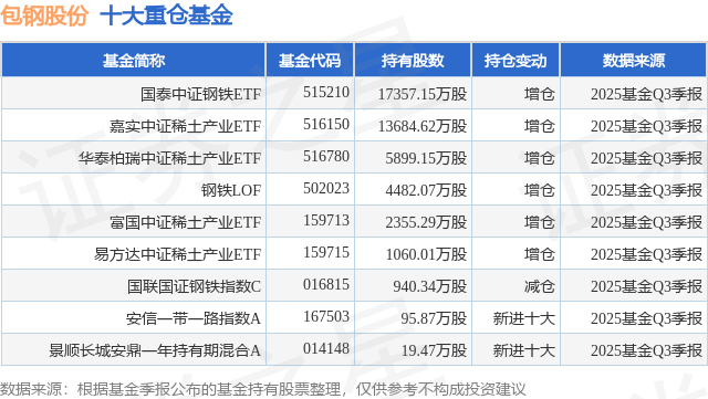 根据2025基金Q3季报公募基金重仓股数据,重仓该股的公募基金共9家,其中持有数量最多的公募基金为国泰基金的国泰中证钢铁ETF。国泰中证钢铁ETF目前规模为36.6亿元,最新净值1.5074(11月3日),较上一交易日上涨1.94%,近一年上涨25.8%。该公募基金现任基金经理为吴中昊。吴中昊在任的基金产品包括:国泰中证500指数增强A,管理时间为2022年1月28日至今,期间收益率为27.29%;国泰中证内地运输主题ETF,管理时间为2022年11月30日至今,期间收益率为-2.36%;国泰沪深300指数增强A,管理时间为2022年12月30日至今,期间收益率为18.19%;国泰国证新能源汽车指数C,管理时间为2022年12月30日至今,期间收益率为20.17%。