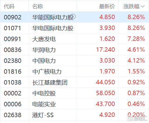 格隆汇4月26日丨华能国际电力、华电国际电力涨超8%,大唐发电涨超7%,华润电力、中国电力涨超4%,中广核电力、中电控股等纷纷走高。