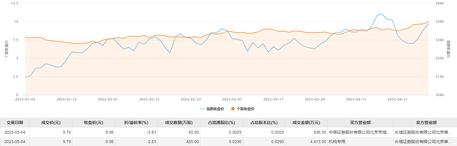 5月4日大宗交易成交500万股,成交额4850万元,占当日总成交额的6.39%,成交价9.7元,较市场收盘价9.98元折价2.81%。