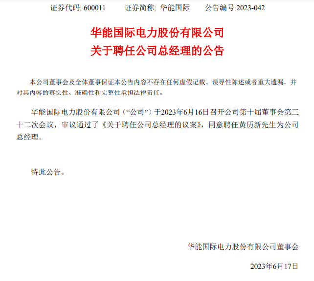 6月16日,华能国际第十届董事会第三十二次会议,审议通过了《关于聘任公司总经理的议案》,同意聘任黄历新先生为公司总经理。