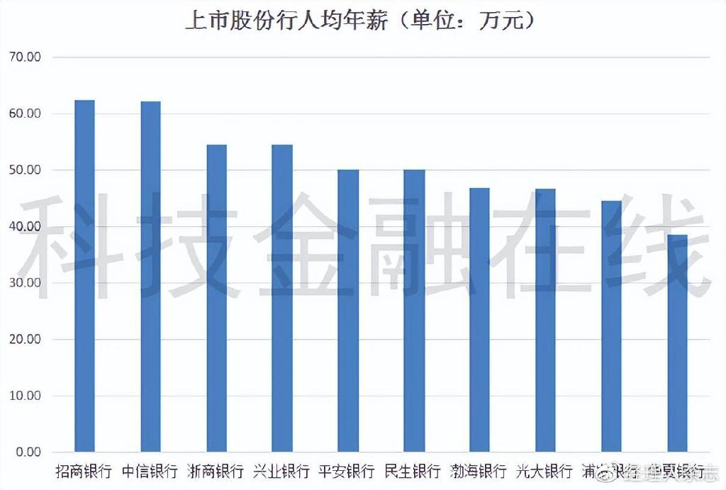 其中,招行以62.53万元的人均年薪拔得股份行头筹,中信银行以62.32万元排在第二。