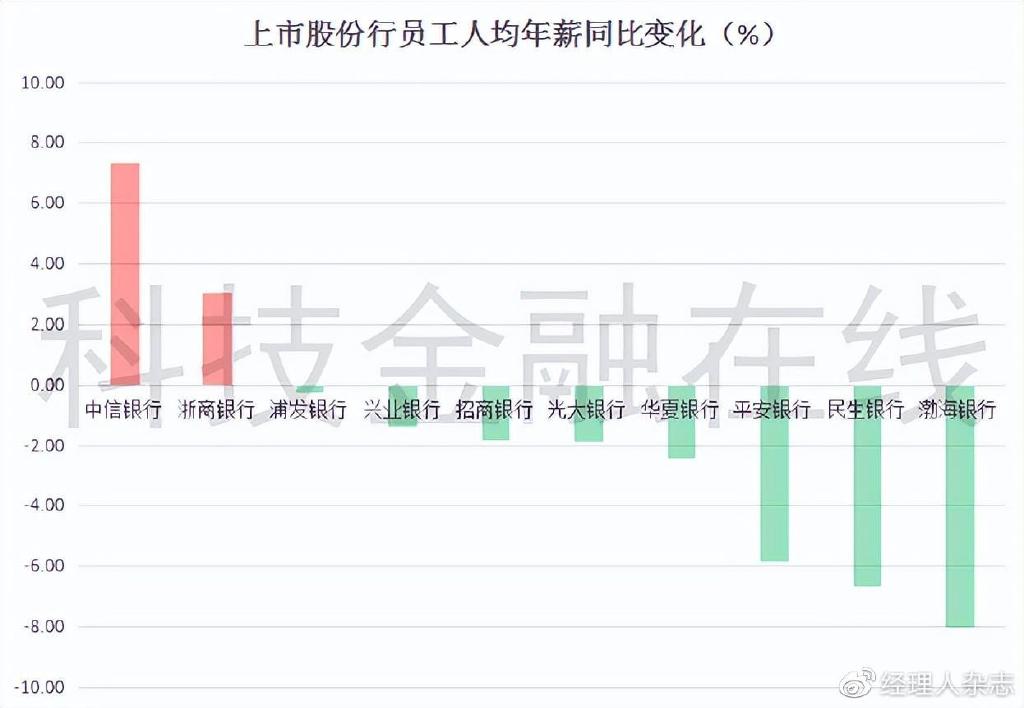 其中,人均年薪同比降幅超过5%的有三家,分别是渤海银行、民生银行、平安银行。