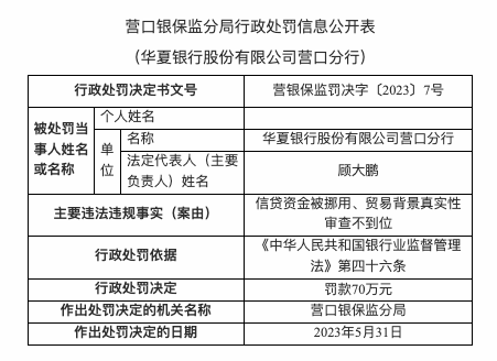 因信贷资金被挪用等,华夏银行营口分行被罚70万