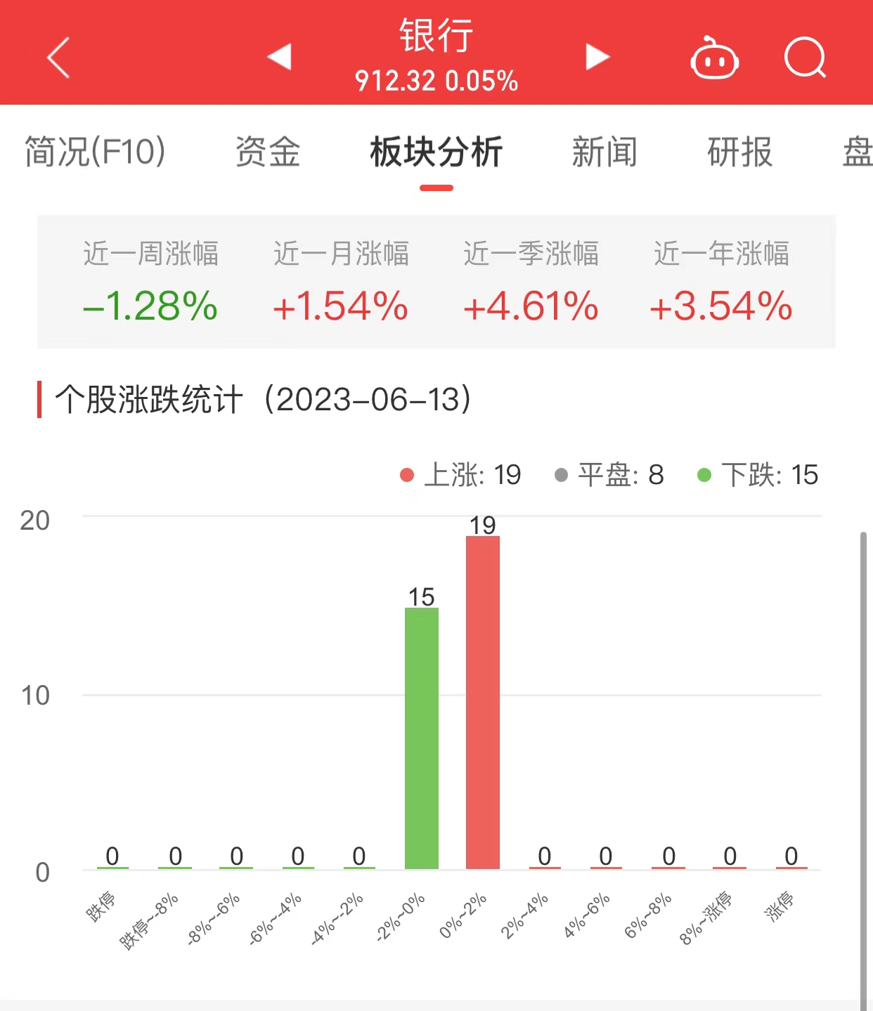 中国经济网北京6月13日讯今日,银行板块整体涨幅0.05%,其中19只股票上涨,8只股票平盘,15只股票下跌。