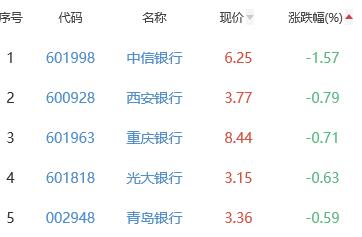 中信银行、西安银行、重庆银行、光大银行、青岛银行位列涨幅榜后五位,涨幅分别为-1.57%、-0.79%、-0.71%、-0.63%、-0.59%。