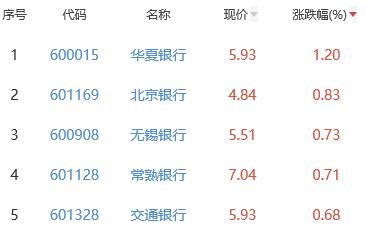 其中,华夏银行、北京银行、无锡银行、常熟银行、交通银行位列板块涨幅前五位,涨幅分别为1.20%、0.83%、0.73%、0.71%、0.68%。